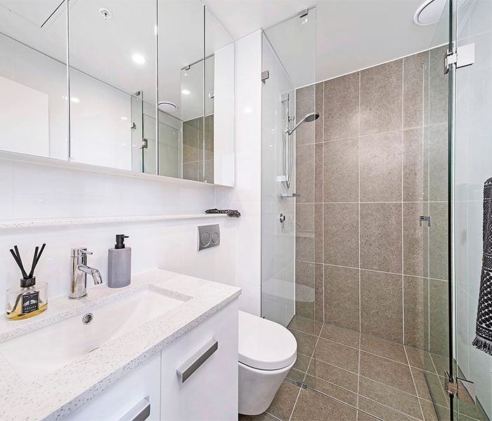 A choice of two interior colour schemes in lighter and warmer tones cater to a variety of tastes. Sleek and minimalist designer bathrooms feature floor-to-ceiling large-format tiles, baths and semi-frameless shower screen. Gourmet kitchens are appointed with polyurethane joinery, hardwearing reconstituted stone benchtops and quality European appliances, including a 4 burner gas cooktop. Additional details include built-in wardrobes, air conditioning, audio visual intercom and laundries with dryers.